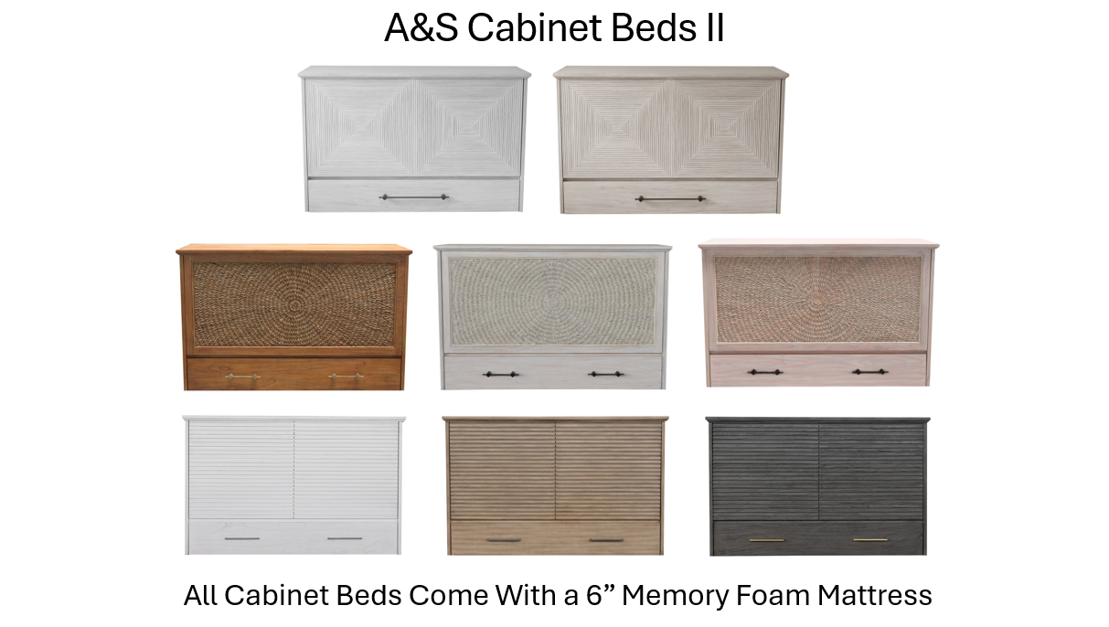 Breezy, versatile, and space-saving, our Queen Size Cabinet Beds blend coastal charm with modern function. Expertly crafted from solid wood with rattan and banana leaf accents, each freestanding unit transforms from a stylish cabinet into a comfortable Queen Size bed with a tri-fold memory foam mattress. Designed with built-in power, hidden storage, and a stationary top for display, these beds require no wall attachment or installation from the customer. With several distinctive styles, they offer the perfect combination of elegance, utility, and ease—for any room, from coastal to contemporary.