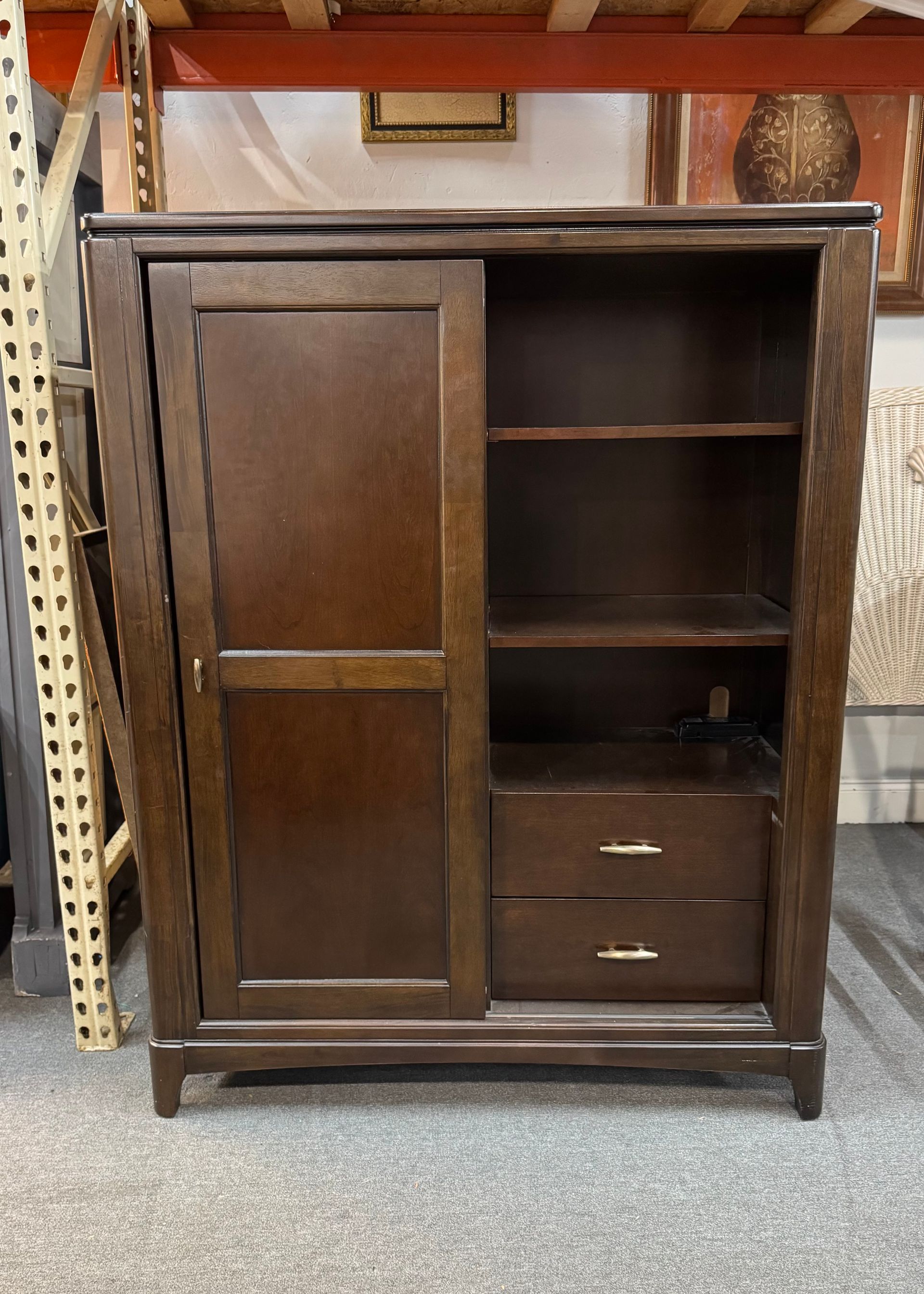 Description: This Henredon armoire is a stunning piece of furniture that will add elegance and sophistication to any room. It features a sleek black wood finish with gorgeous red and gold accents that create a striking contrast. The four doors have a raised wood trim design that adds texture and dimension to the armoire. Inside, you'll find three spacious shelves and two drawers that offer plenty of storage space for your clothes, accessories, or other items. This armoire is not only beautiful, but also durable and functional. It's a must-have for anyone who loves luxury and style."