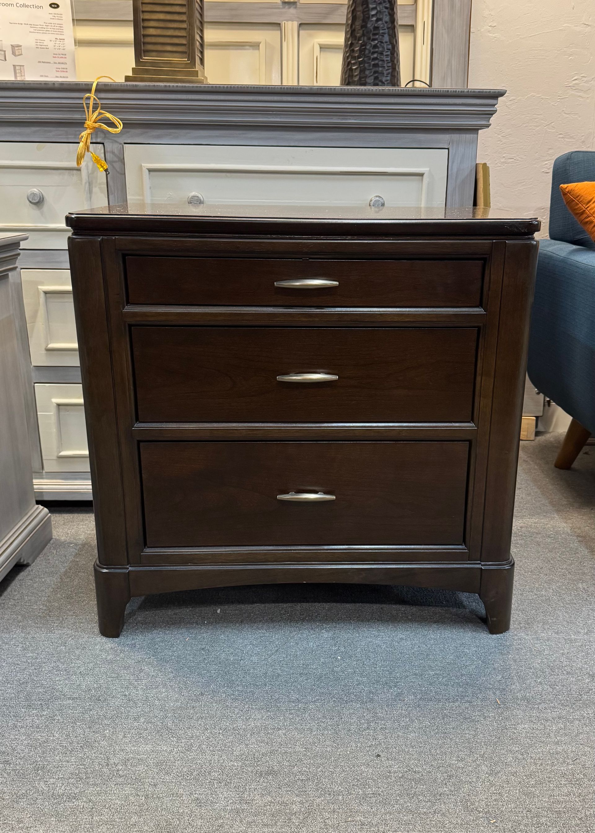 Description: modern dark brown 1 drawer nightstand with shelf and satin handle