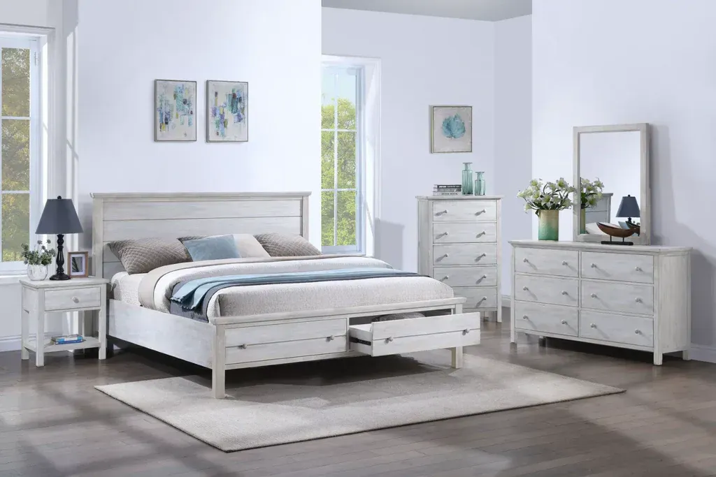 Cape May is featured in a White Oak with a Cathedral Cut in a wire brushed, driftwood finish and slight cerusing. Drawer fronts are expertly routered out to give depth. Hardware has a gradual stepped design with a pewter finish. Tapered legs finish the case, nightstand has power with USB/USBC.