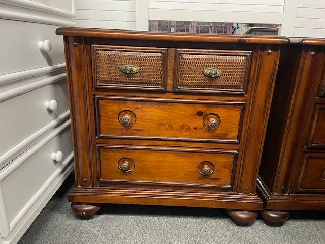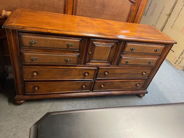 Description: Medium brown wood with wicker accents tropical style bedroom set. With King-Bed, Dresser, Mirror & 2 nightstands