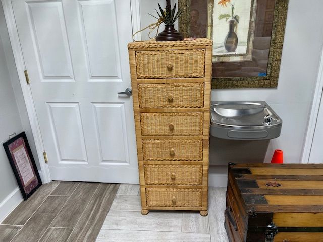 Description: Add some charm and elegance to your bedroom with this lovely 4 drawer whitewash wicker chest. This chest features a sturdy wooden frame with a beautiful whitewash finish that complements any decor. The four spacious drawers are made of natural wicker and have a lattice bottom for extra durability. The drawers also have smooth metal glides and round knobs for easy opening and closing. The top of the chest is covered with a clear glass panel that protects the wicker and adds a touch of sophistication. This chest is perfect for storing your clothes, accessories, linens, and more. Whether you place it in your master bedroom, guest room, or kids' room, this chest will bring warmth and style to your space."