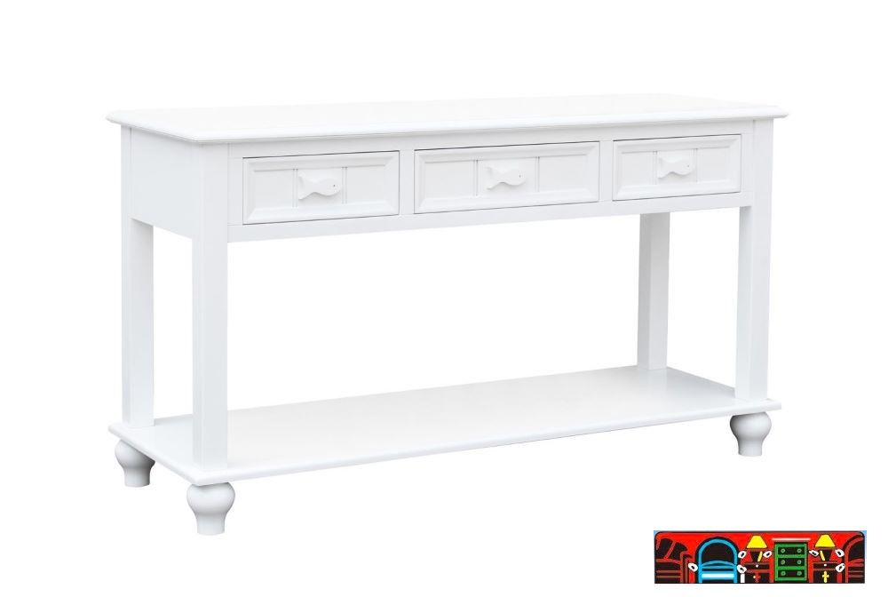 Introducing the Smithe Sofa Table, a stunning two-toned masterpiece that effortlessly blends classic white with a rich brown top. Equipped with two spacious drawers, this table is not just about style but also functionality. The decorative middle legs add a touch of elegance, while the bottom shelf offers additional space for your decorative items or books. It's the perfect addition to any living space!"