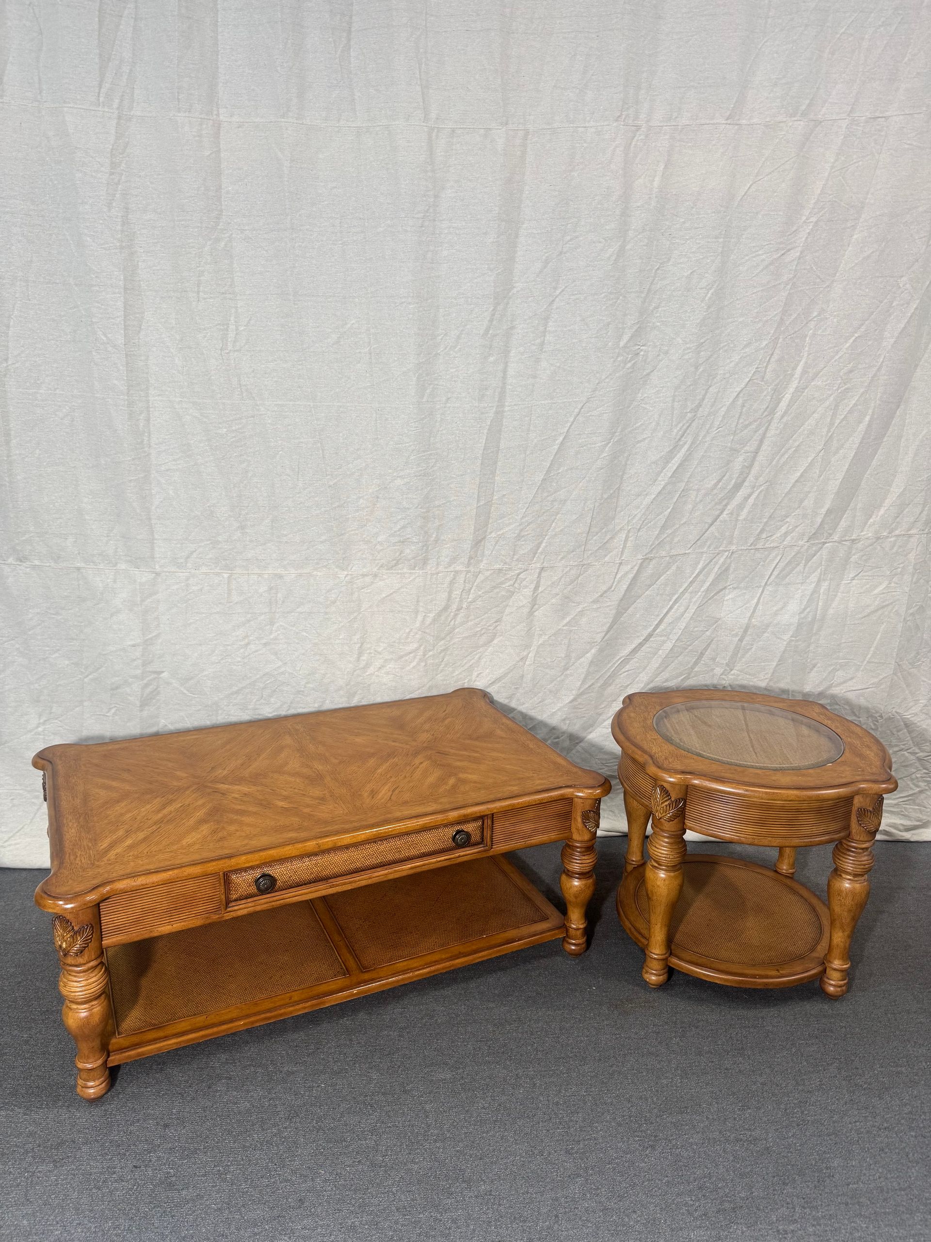 Discover the epitome of elegance with Tommy Bahama's End Table! Crafted from the finest Mahogany Solids and adorned with American Maple and Mahogany Veneers, Adorned with a sleek glass top that reveals a chic recessed woven panel beneath, this exquisite piece boasts two spacious drawers to keep your essentials organized in style."