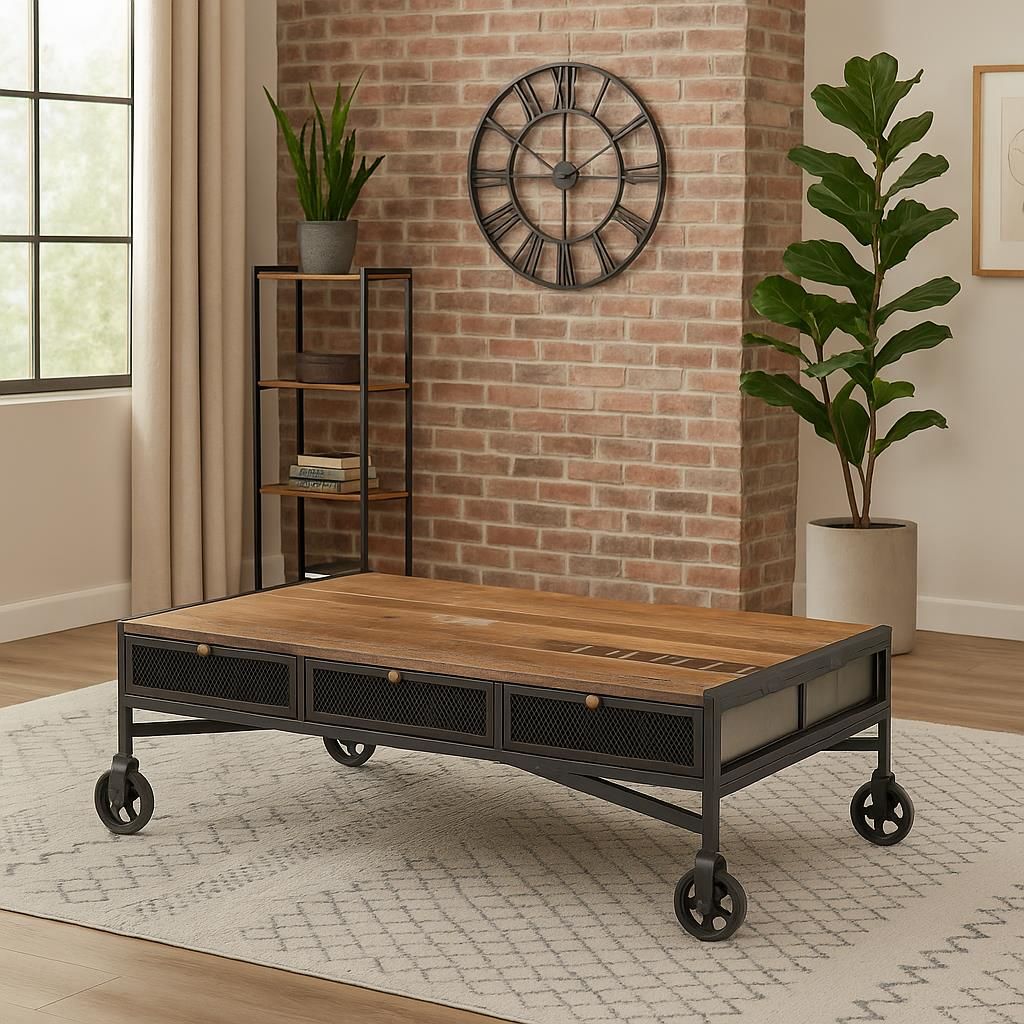 Introducing the epitome of modern elegance and functional design - our square cocktail table! Crafted with a robust brown iron base, this piece exudes durability and stability. The faux painted top adds a touch of artistic flair, creating a visual delight that's sure to be the centerpiece of any room. But wait, there's more! Nestled within the exquisite design is a beveled glass inlay, adding a layer of sophistication and reflecting light in the most enchanting way. Perfect for gatherings or a quiet evening at home, this table is not just furniture; it's a statement!"