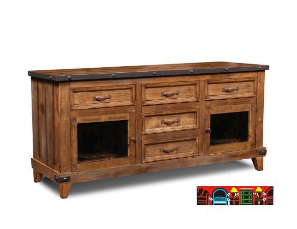 Get ready to elevate your living space with this stunning medium brown entertainment console! It boasts a trio of sleek drawers perfectly aligned on the top row, complemented by two additional ones nestled in the middle. But that's not all - each side is adorned with elegant glass-fronted doors that exude sophistication. The console is framed by a robust cast metal band running along the front and side edges, adding an industrial flair. And for that final touch of class, it features exquisite copper-colored handles that will catch the eye of any design enthusiast!"