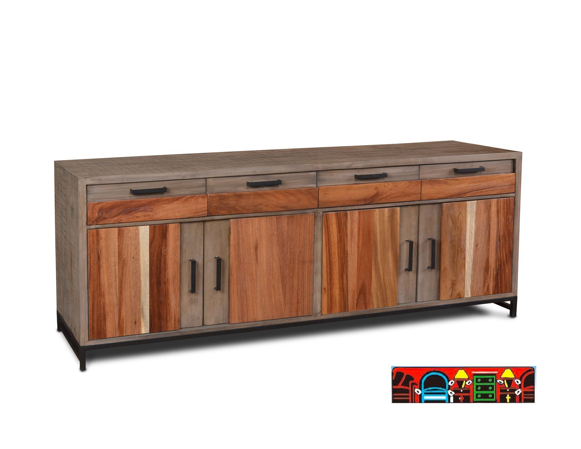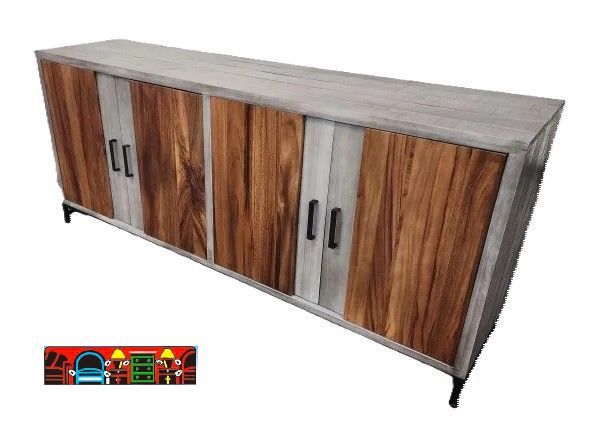 Discover the rustic charm of our solid wood console, featuring a unique two-tone palette of warm brown and chic grey. Each of the four drawers and doors reveals ample storage, crafted with care to offer both style and functionality. The distressed multi-layer lacquer finish adds an inviting depth to the piece, while the sturdy cast-metal legs and handles provide a touch of industrial flair. This console is not just furniture; it's a statement piece that brings character to any space."