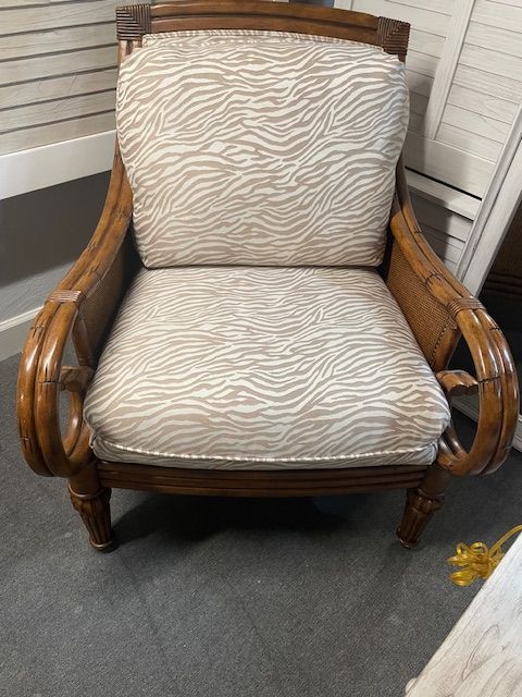 Introducing the epitome of exotic elegance: our medium brown accent arm chair! With its meticulously carved exposed wood frame and bold tiger print fabric, it's a statement piece that roars with style. Perfect for those who dare to stand out!"