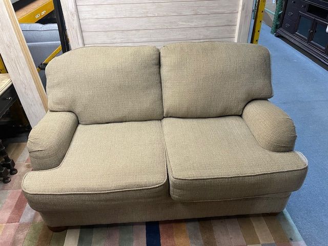 Description: You'll love this Clayton Marcus Conversation Sofa that comes with throw pillows and a skirt. It has a curved frame that adds elegance and charm to your living room. The medium brown fabric is cozy and durable, and the contrasting throw pillows add a splash of color and style. This sofa is perfect for hosting guests, relaxing with your family, or having a cozy conversation. Don't miss this opportunity to get this amazing sofa at a great price!