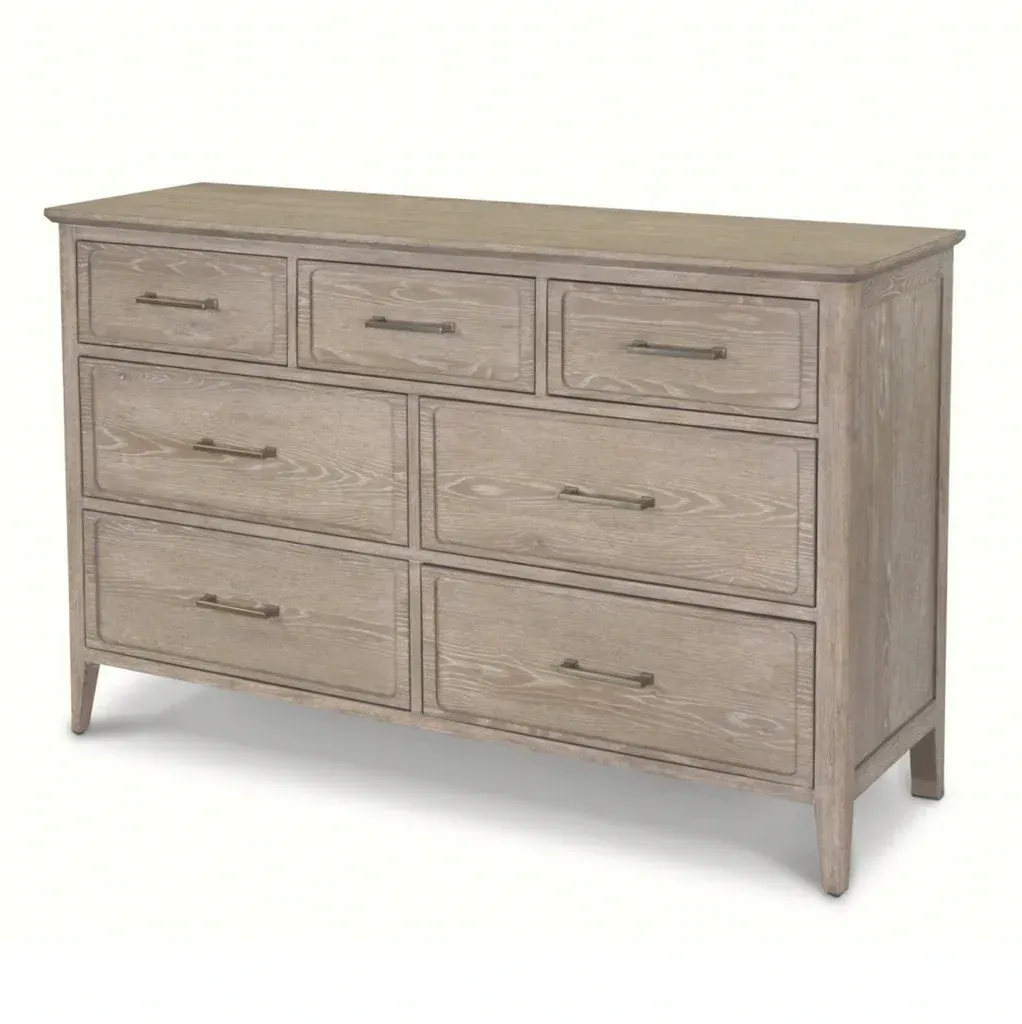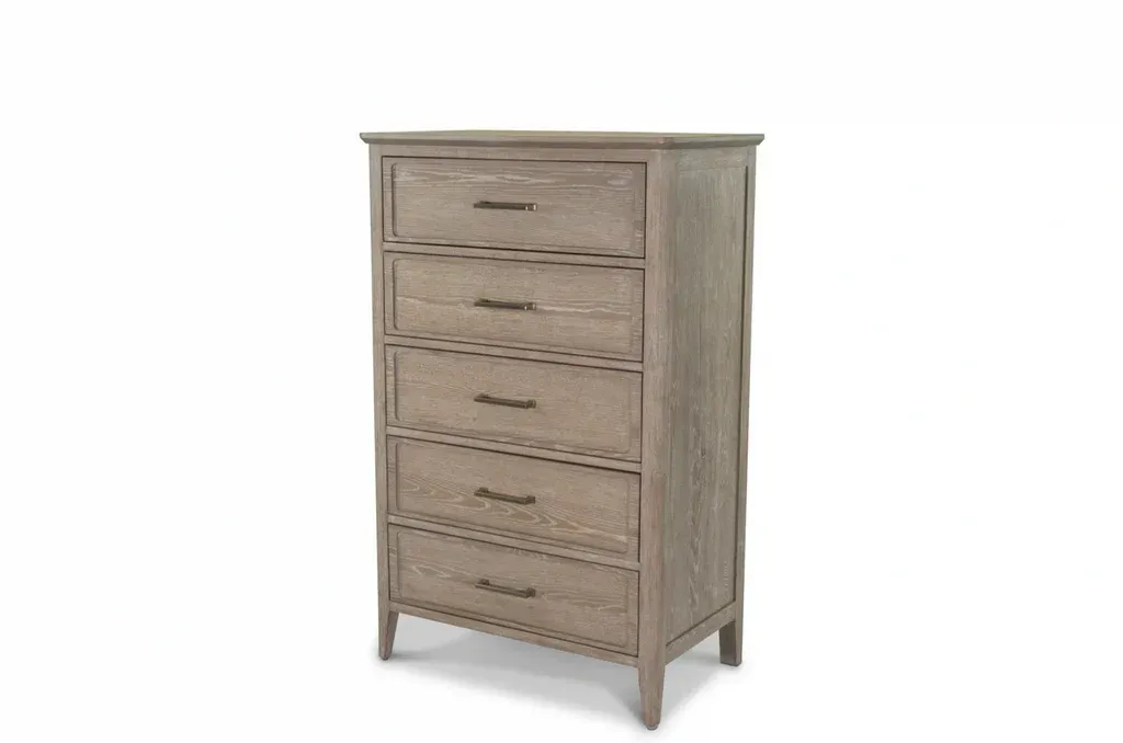 Cases are White Oak with a Cathedral Cut in a wire brushed driftwood finish and slight cerusing. Drawer fronts are expertly routered out to give depth. Hardware has a gradual stepped design with pewter finish, tapered legs finish case. Nightstand has USB/USBC.